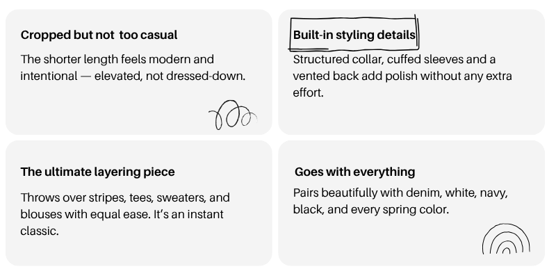 It’s been a warmer spring here, but we are not out of layering season quite yet. And I love when a jacket does all the heavy lifting of an outfit, even if you just threw it on over a tee and jeans. This year, I keep coming back to four styles that feel especially perfect for spring and I wanted to share them with you! Each option brings a little something different to your wardrobe. But I promise all of them are easy, wearable, and versatile enough to mix into what you already own.