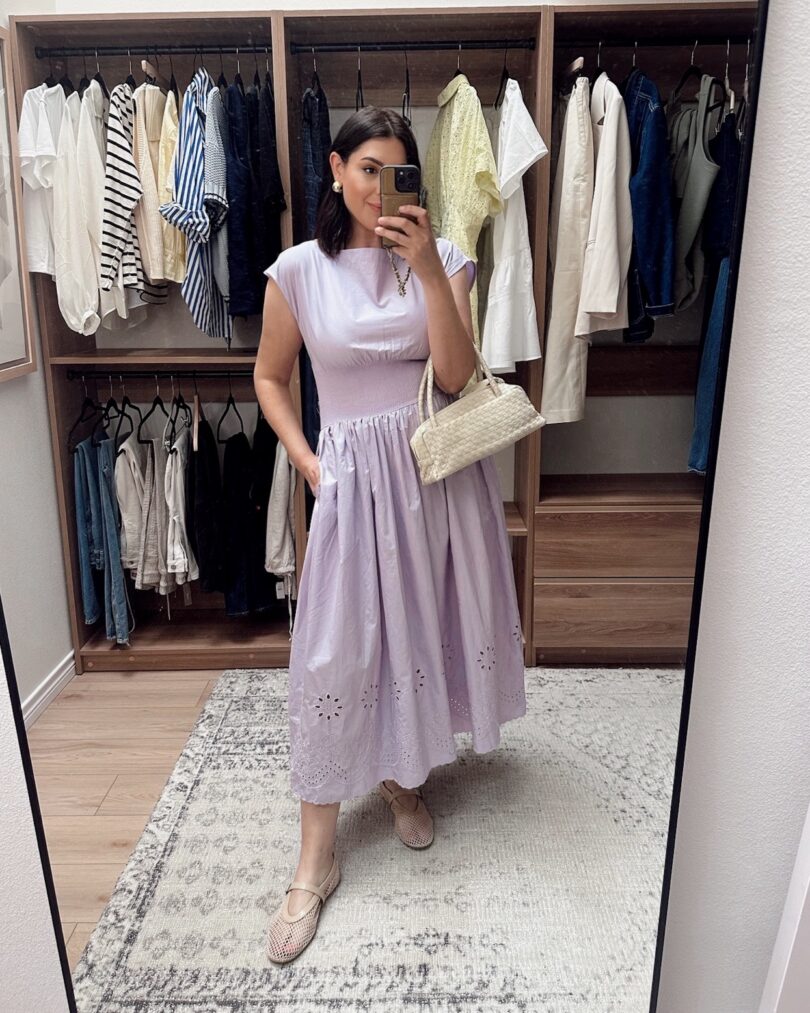 I love, love this dress from J.Crew. It’s the sweetest little lilac hue and I tend to shy away from too twee of colors but this one got me. (It also comes in brown if you like a neutral!) This dress is on sale, too! J.Crew is 30% off dresses right now. It’s very flattering as well, I don’t have the smallest of waists and the smocking holds me in well! I am in the medium here.