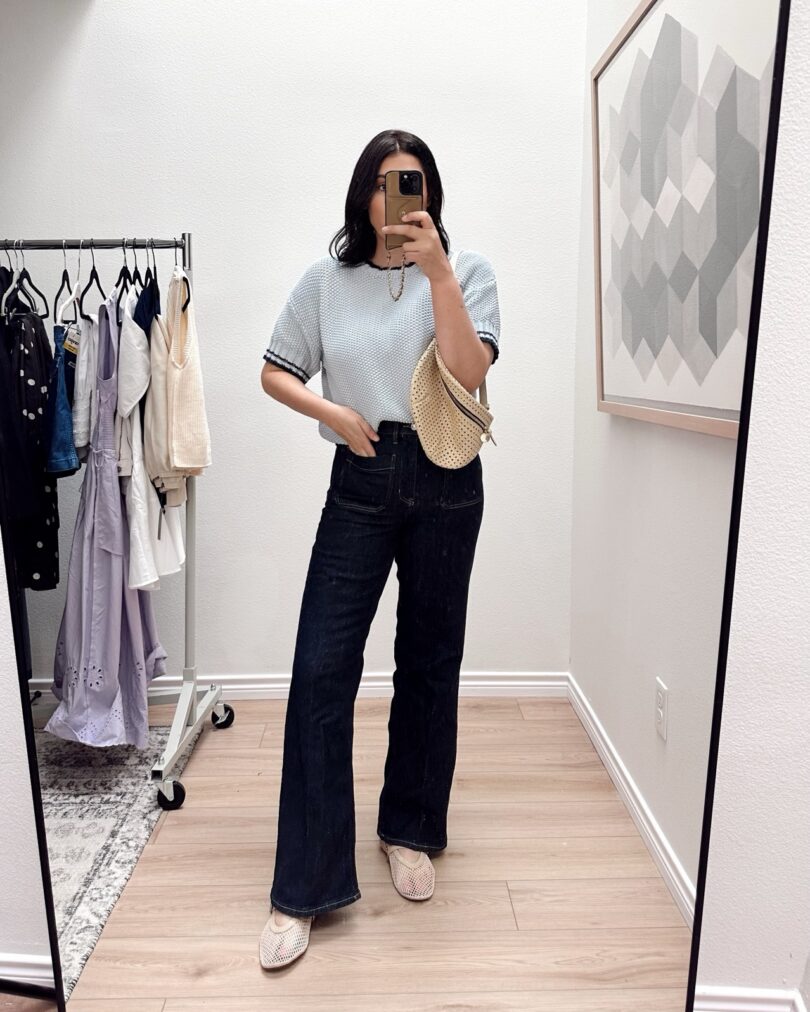 Splendid Sweater | Spanx Flare Jeans | Mesh Flats | Clare V Grande FannyÂ