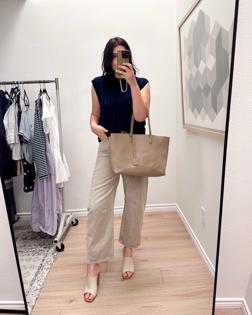 J.Crew Cashmere Vest | CoH Barrel Jeans | Similar Wedges | Tote