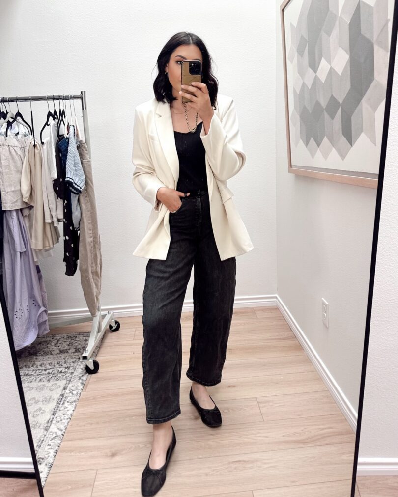 Amazon Blazer | Quince Camisole | Spanx Barrel Jeans | Mesh Flats